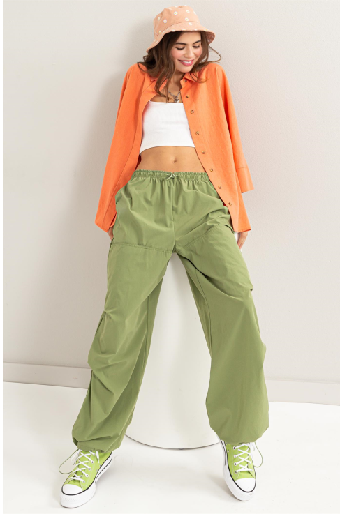 Strut your stuff in these elevated cargo pants that blend comfort with contemporary flair. The high-waisted silhouette with drawstring and button fastening keeps you secure, while generously sized pockets and customizable ankle cuffs let you dial in your perfect fit. Whether you're lounging around or heading out for a relaxed evening, these versatile pants deliver both ease and edge..